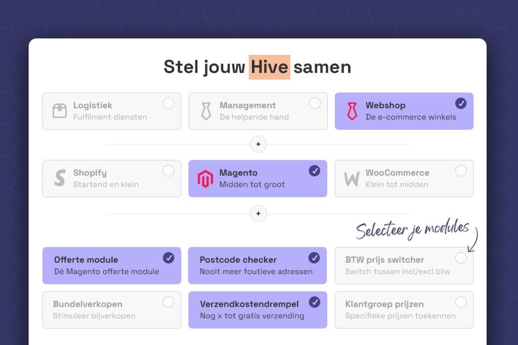 Zo profiteer je van e-commerce- en logistieke expertise, terwijl je alleen betaalt voor de modules die je nodig hebt. Of je nu je met je webshop wilt opschalen of fulfilment wilt optimaliseren, met onze Hive krijg je een flexibele, schaalbare oplossing.